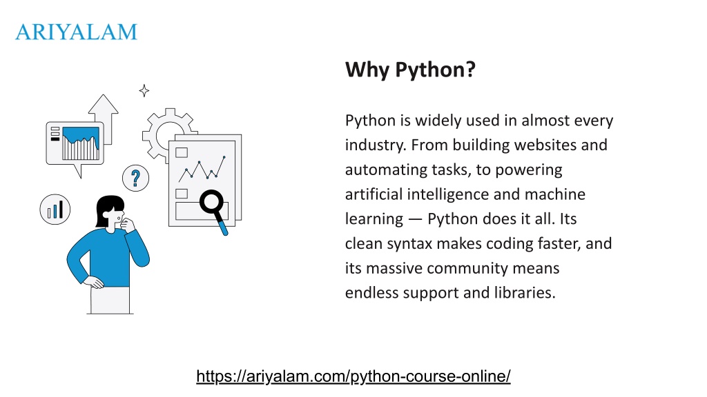 Why Python? Python is widely used in almost every industry. From building websites and automating tasks, to powering artificial intelligence and machine learning — Python does it all. Its clean syntax makes coding faster, and its massive community means endless support and libraries. https://ariyalam.com/python-course-online/