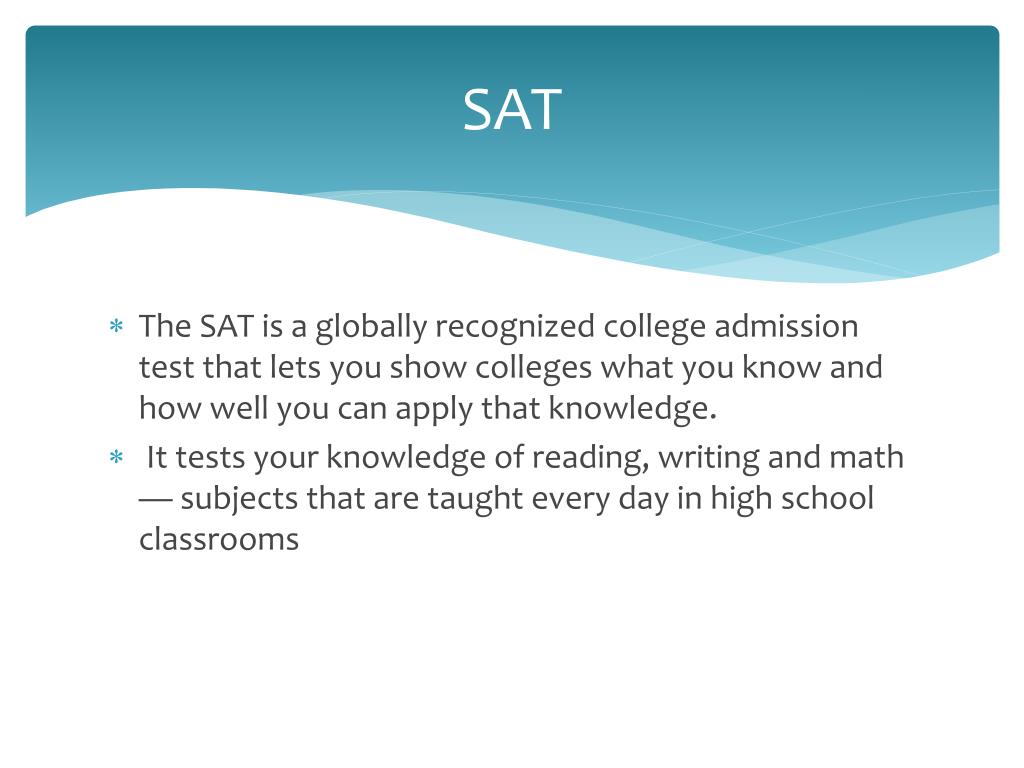 SAT The SAT is a globally recognized college admission test that lets you show colleges what you know and how well you can apply that knowledge. It tests your knowledge of reading, writing and math — subjects that are taught every day in high school classrooms