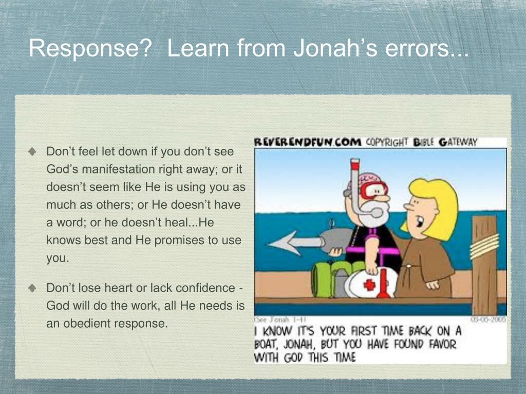Response? Learn from Jonah’s errors... • Don’t feel let down if you don’t see God’s manifestation right away; or it doesn’t seem like He is using you as much as others; or He doesn’t have a word; or he doesn’t heal...He knows best and He promises to use you. • Don’t lose heart or lack confidence - God will do the work, all He needs is an obedient response.
