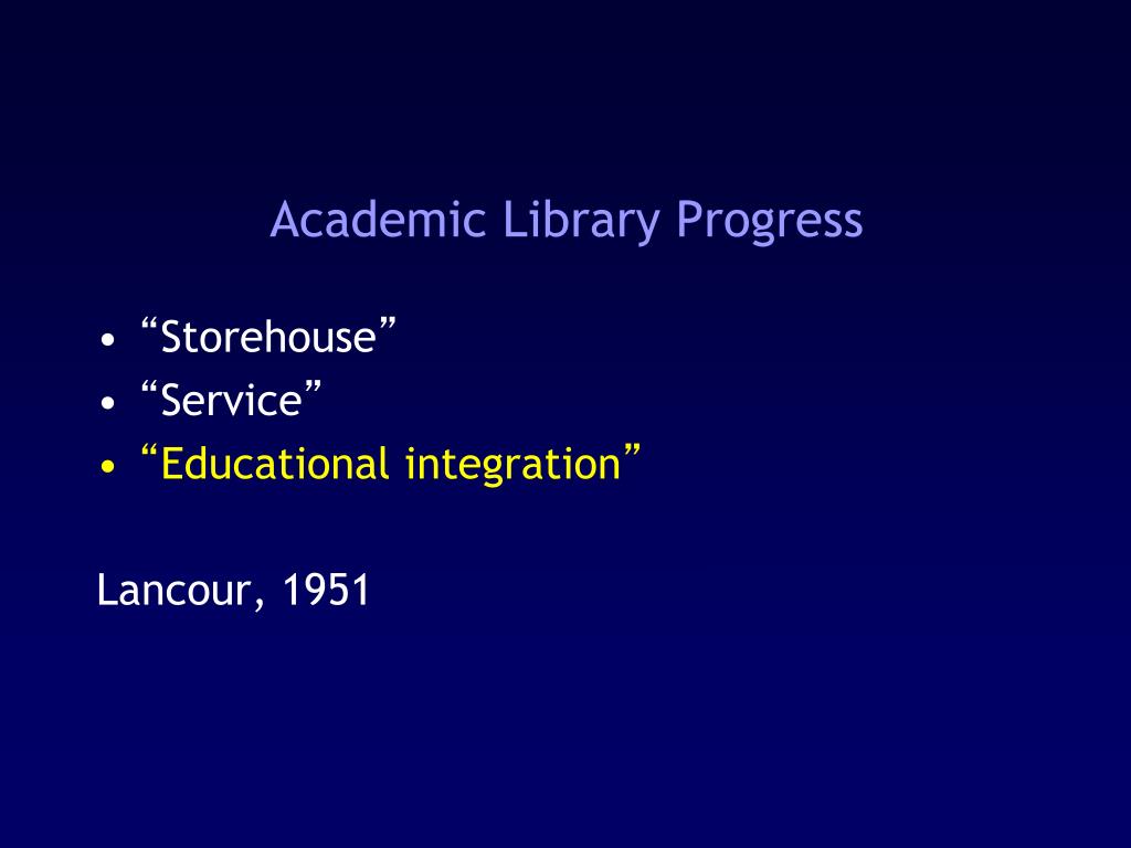 Academic Library Progress • “Storehouse” • “Service” • “Educational integration” Lancour, 1951