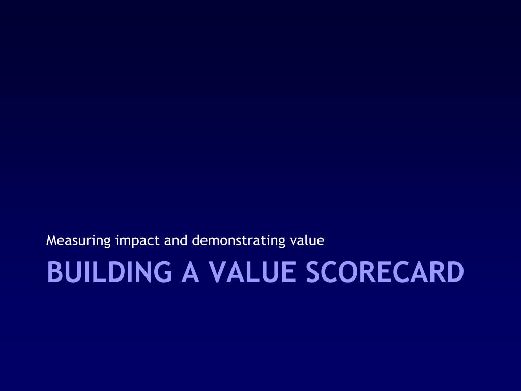 The Value ScorecardDimension 4: Library Momentum • Capital saved or gained by progress • Capital assets developed early • Facilitation of research capital • Facilitation of learning capital • Facilitation of quality • Capital saved by sustainability