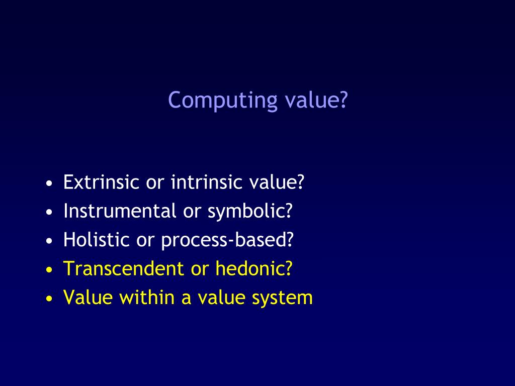 Computing value? • Extrinsic or intrinsic value? • Instrumental or symbolic? • Holistic or process-based? • Transcendent or hedonic? • Value within a value system