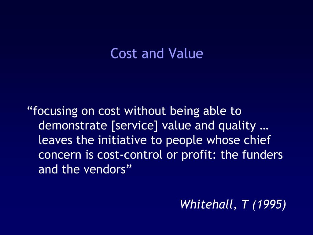 Cost and Value “focusing on cost without being able to demonstrate [service] value and quality … leaves the initiative to people whose chief concern is cost-control or profit: the funders and the vendors” Whitehall, T (1995)