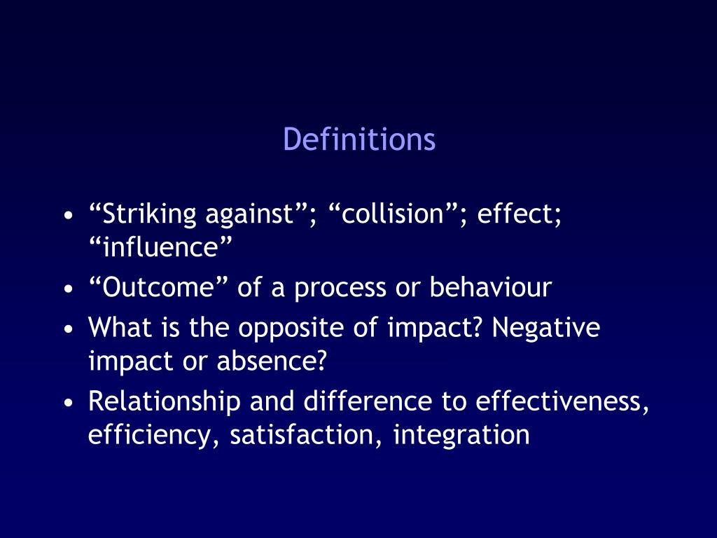 Definitions • “Striking against”; “collision”; effect; “influence” • “Outcome” of a process or behaviour • What is the opposite of impact? Negative impact or absence? • Relationship and difference to effectiveness, efficiency, satisfaction, integration