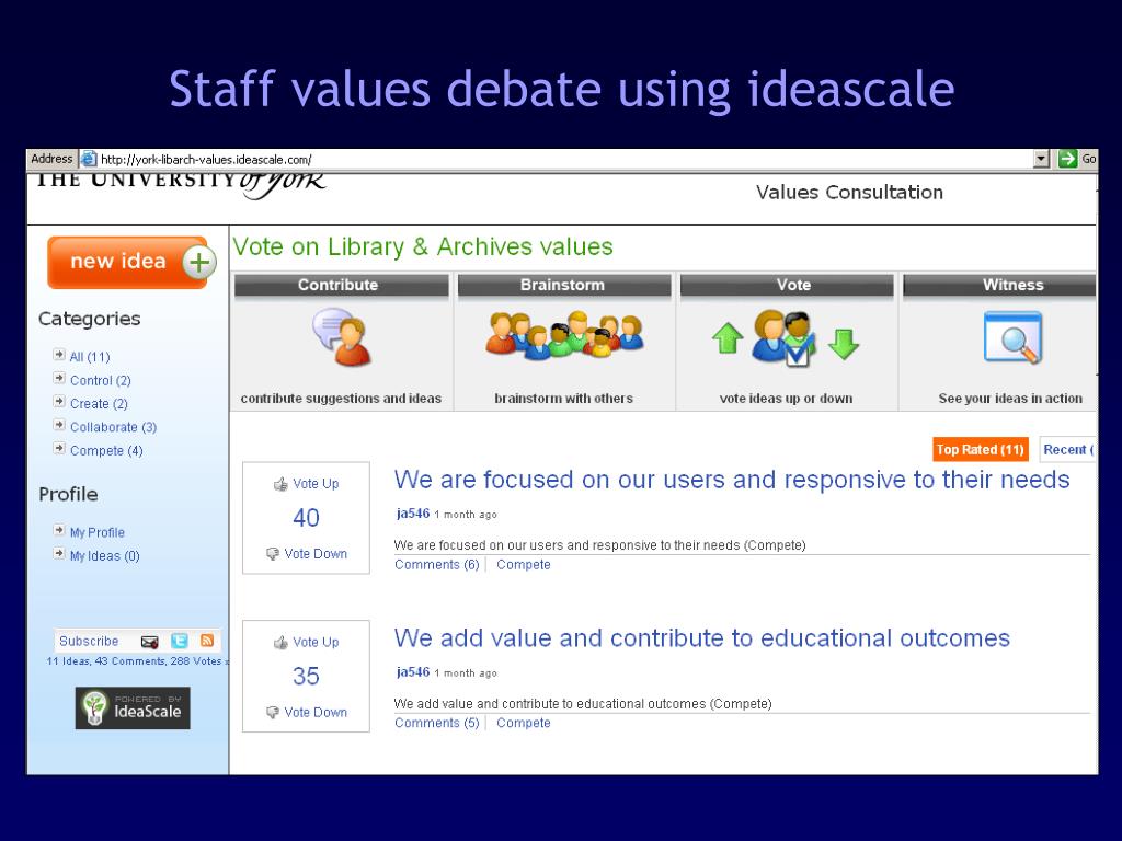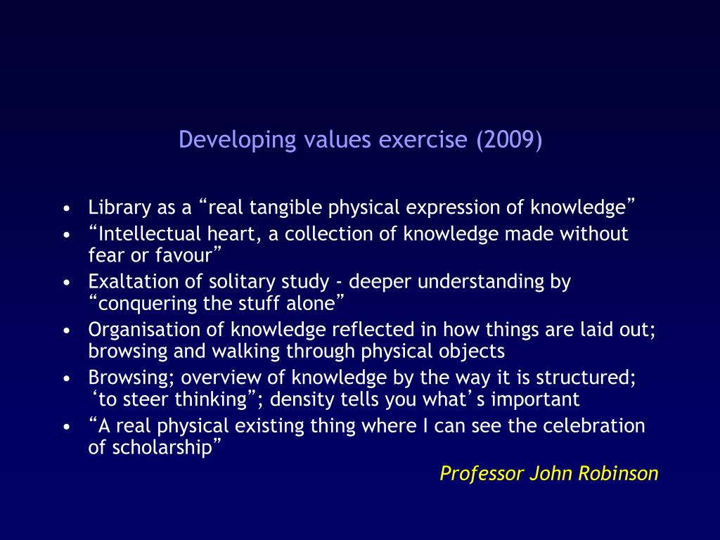 Developing values exercise (2009) • Library as a “real tangible physical expression of knowledge” • “Intellectual heart, a collection of knowledge made without fear or favour” • Exaltation of solitary study - deeper understanding by “conquering the stuff alone” • Organisation of knowledge reflected in how things are laid out; browsing and walking through physical objects • Browsing; overview of knowledge by the way it is structured; ‘to steer thinking”; density tells you what’s important • “A real physical existing thing where I can see the celebration of scholarship” Professor John Robinson