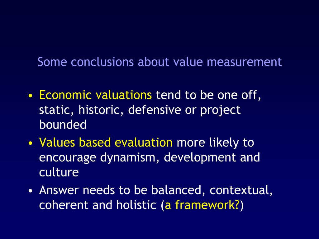 Some conclusions about value measurement • Economic valuations tend to be one off, static, historic, defensive or project bounded • Values based evaluation more likely to encourage dynamism, development and culture • Answer needs to be balanced, contextual, coherent and holistic (a framework?)