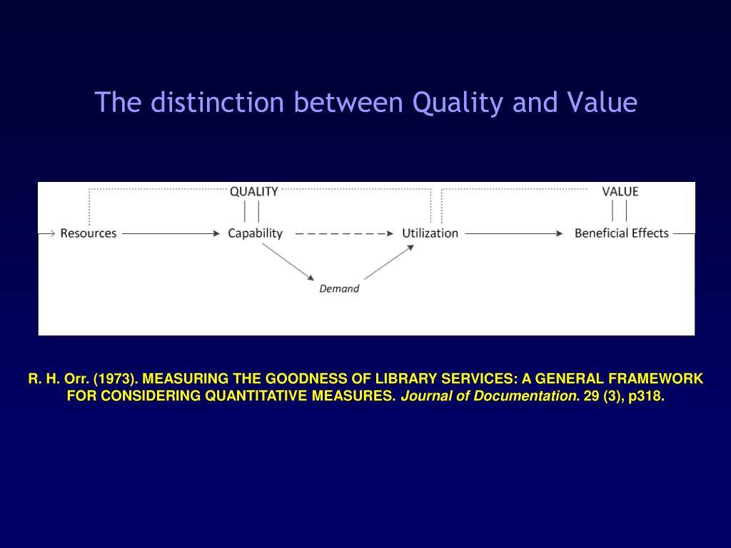 The distinction between Quality and Value R. H. Orr. (1973). MEASURING THE GOODNESS OF LIBRARY SERVICES: A GENERAL FRAMEWORK FOR CONSIDERING QUANTITATIVE MEASURES. Journal of Documentation. 29 (3), p318.