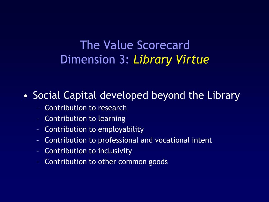 The Value ScorecardDimension 3: Library Virtue • Social Capital developed beyond the Library • Contribution to research • Contribution to learning • Contribution to employability • Contribution to professional and vocational intent • Contribution to inclusivity • Contribution to other common goods