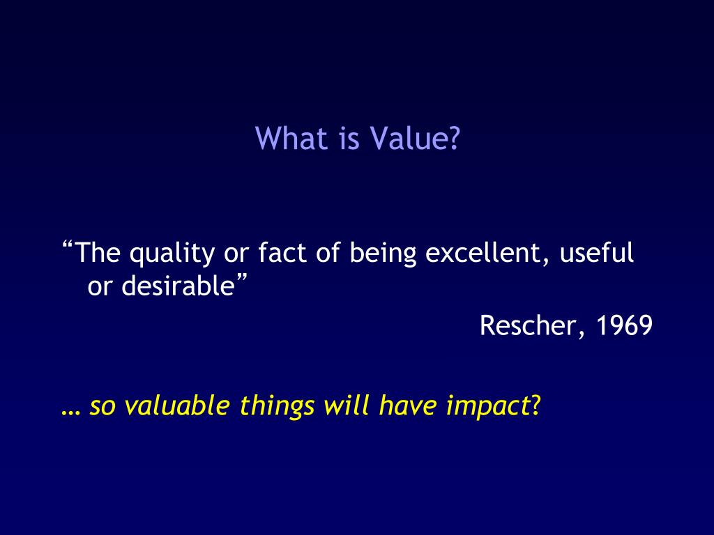What is Value? “The quality or fact of being excellent, useful or desirable” Rescher, 1969 … so valuable things will have impact?