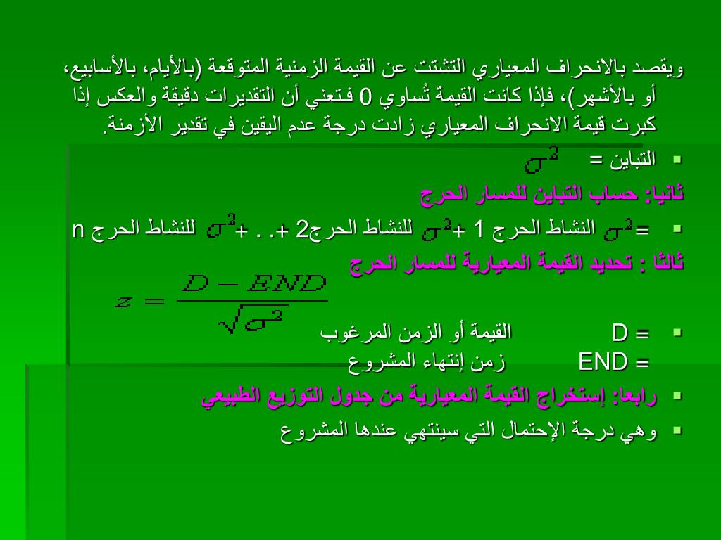 ويقصد بالانحراف المعياريالتشتت عن القيمة الزمنية المتوقعة (بالأيام، بالأسابيع، أو بالأشهر)، فإذا كانتالقيمة تُساوي 0 فـتعنيأن التقديرات دقيقة والعكس إذا كبرت قيمة الانحراف المعياري زادت درجة عدم اليقينفي تقدير الأزمنة . • التباين = ثانيا: حساب التباين للمسار الحرج • = النشاطالحرج 1 + للنشاط الحرج2 + . .+ للنشاط الحرج n ثالثا : تحديد القيمة المعيارية للمسار الحرج • D = القيمة أو الزمن المرغوبEND = زمن إنتهاء المشروع • رابعا: إستخراج القيمة المعيارية من جدول التوزيع الطبيعي • وهي درجة الإحتمال التيسينتهي عندها المشروع