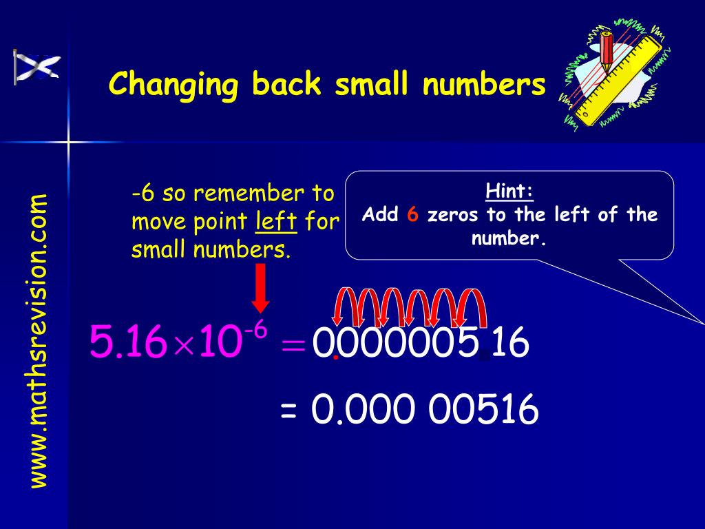 -6 so remember to move point left for small numbers. Changing back small numbers Hint: Add 6 zeros to the left of the number. 5.16 000000 . www.mathsrevision.com = 0.000 00516