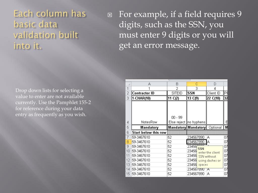 Each column has basic data validation built into it. • For example, if a field requires 9 digits, such as the SSN, you must enter 9 digits or you will get an error message. Drop down lists for selecting a value to enter are not available currently. Use the Pamphlet 155-2 for reference during your data entry as frequently as you wish.