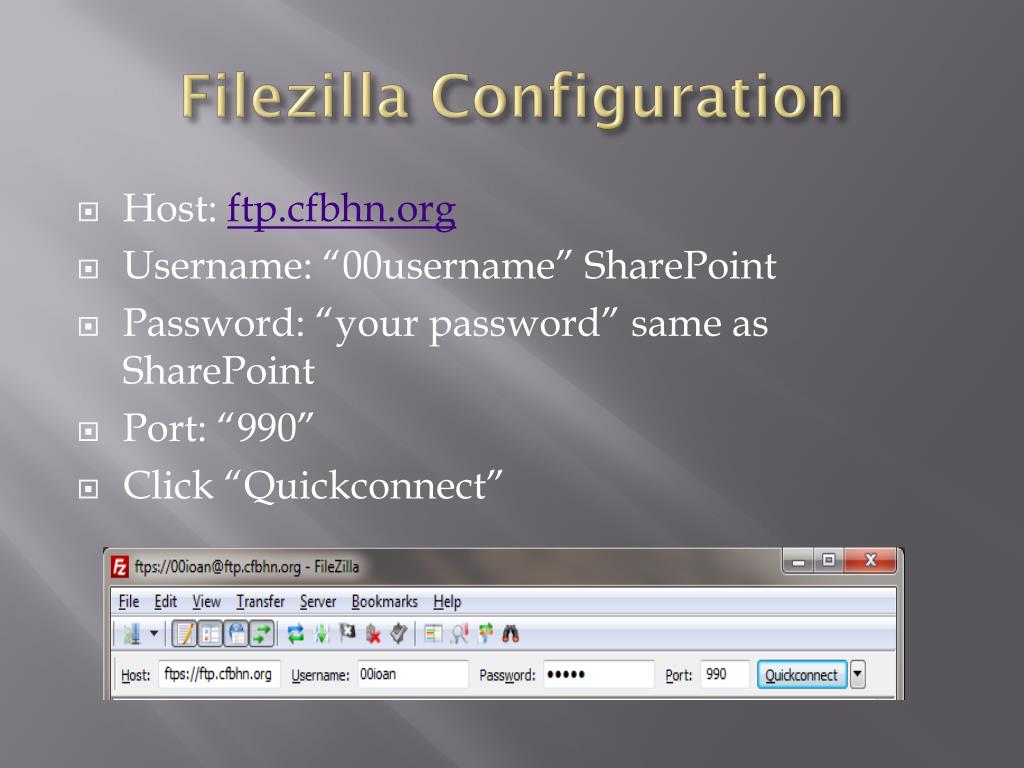 Filezilla Configuration • Host: ftp.cfbhn.org • Username: “00username” SharePoint • Password: “your password” same as SharePoint • Port: “990” • Click “Quickconnect”
