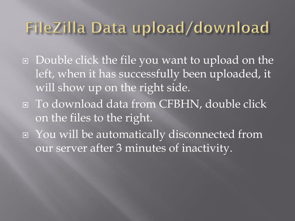 FileZilla Data upload/download • Double click the file you want to upload on the left, when it has successfully been uploaded, it will show up on the right side. • To download data from CFBHN, double click on the files to the right. • You will be automatically disconnected from our server after 3 minutes of inactivity.