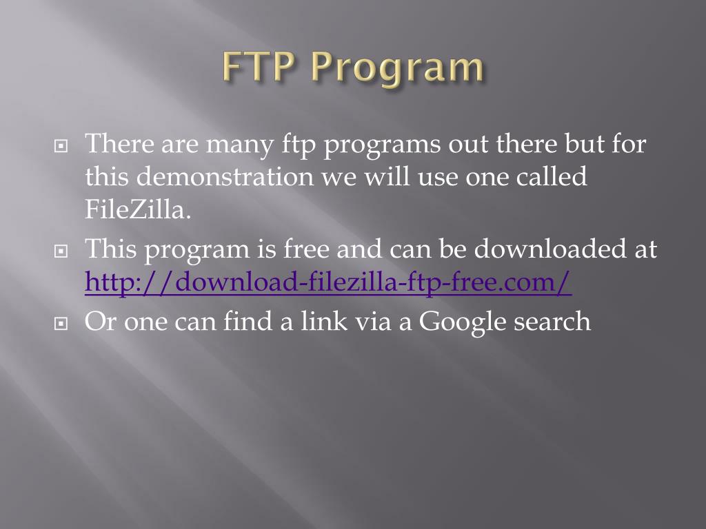 FTP Program • There are many ftp programs out there but for this demonstration we will use one called FileZilla. • This program is free and can be downloaded at http://download-filezilla-ftp-free.com/ • Or one can find a link via a Google search