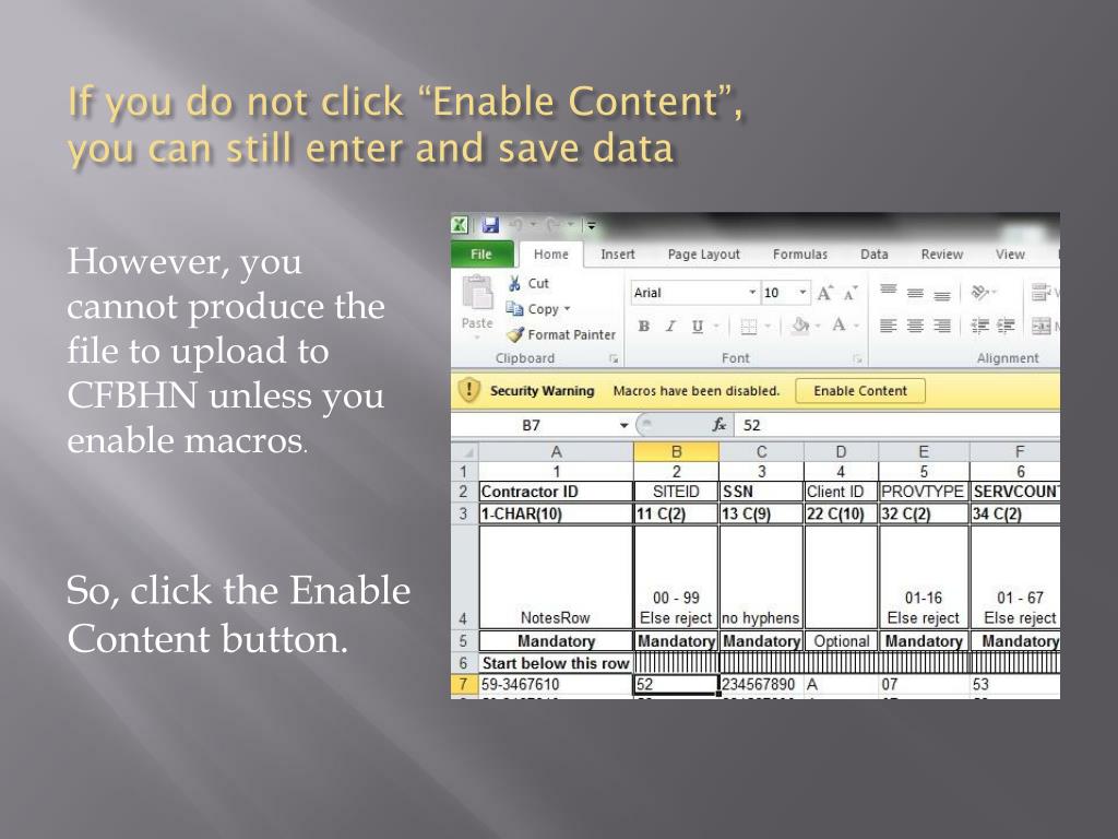 If you do not click “Enable Content”, you can still enter and save data However, you cannot produce the file to upload to CFBHN unless you enable macros. So, click the Enable Content button.