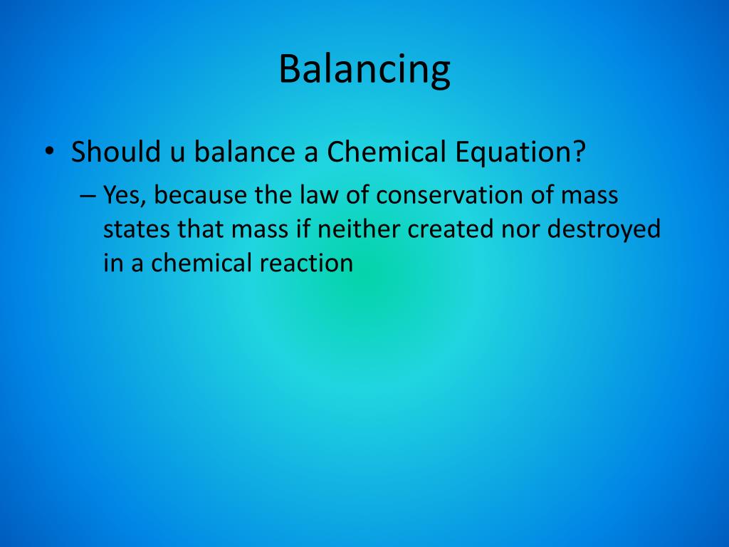 Balancing • Should u balance a Chemical Equation? • Yes, because the law of conservation of mass states that mass if neither created nor destroyed in a chemical reaction