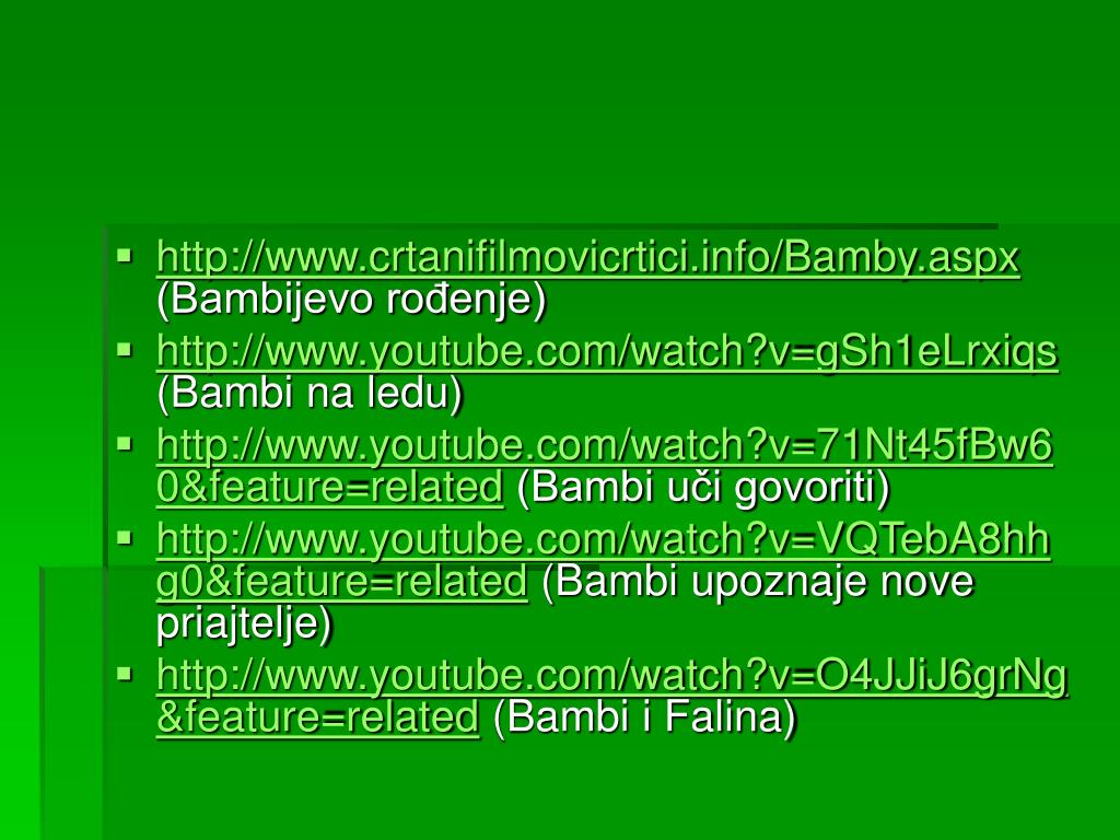 http://www.crtanifilmovicrtici.info/Bamby.aspx (Bambijevo rođenje) • http://www.youtube.com/watch?v=gSh1eLrxiqs (Bambi na ledu) • http://www.youtube.com/watch?v=71Nt45fBw60&feature=related (Bambi uči govoriti) • http://www.youtube.com/watch?v=VQTebA8hhg0&feature=related (Bambi upoznaje nove priajtelje) • http://www.youtube.com/watch?v=O4JJiJ6grNg&feature=related (Bambi i Falina)