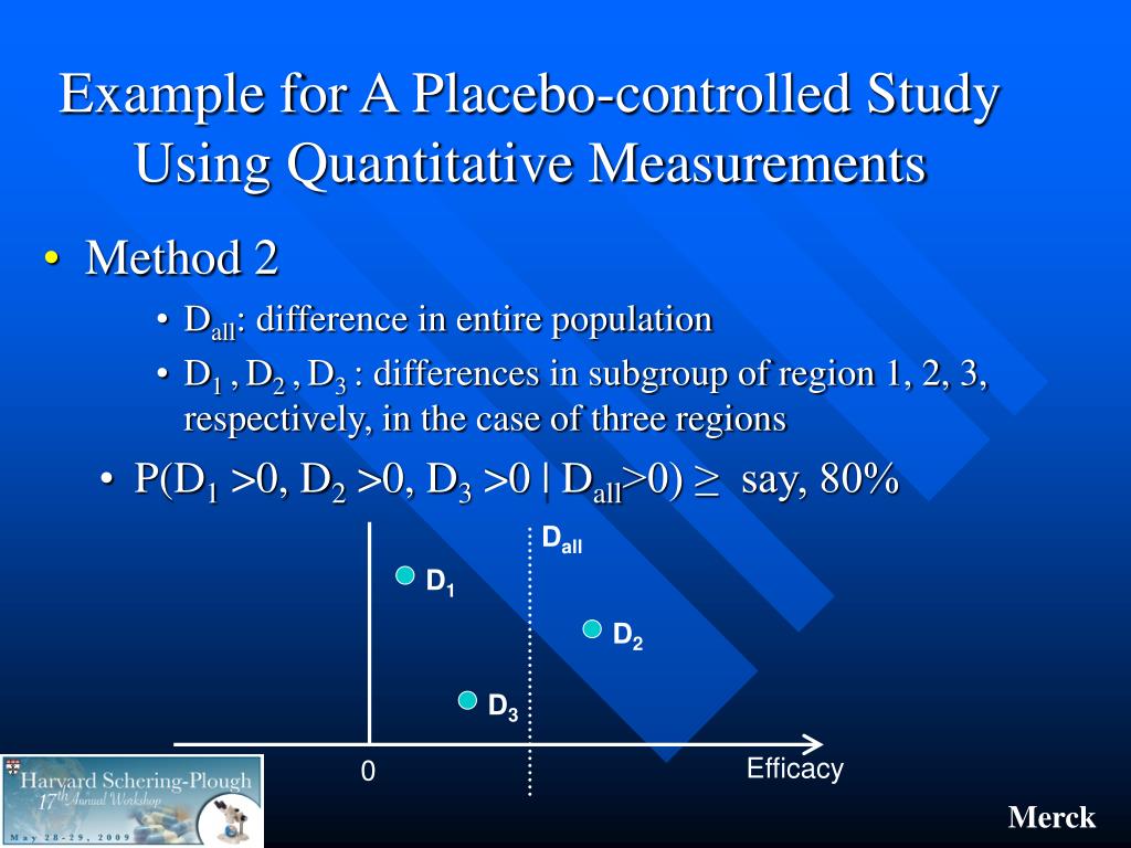 Example for A Placebo-controlled Study Using Quantitative Measurements • Method 2 • Dall: difference in entire population • D1 ,D2 ,D3 : differences in subgroup of region 1, 2, 3, respectively, in the case of three regions • P(D1 >0, D2 >0, D3 >0 | Dall>0) ≥ say, 80% Dall D1 D2 D3 Efficacy 0