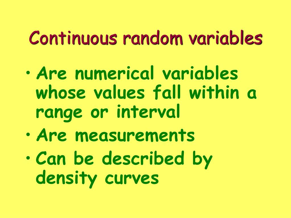 Continuous random variables • Are numerical variables whose values fall within a range or interval • Are measurements • Can be described by density curves