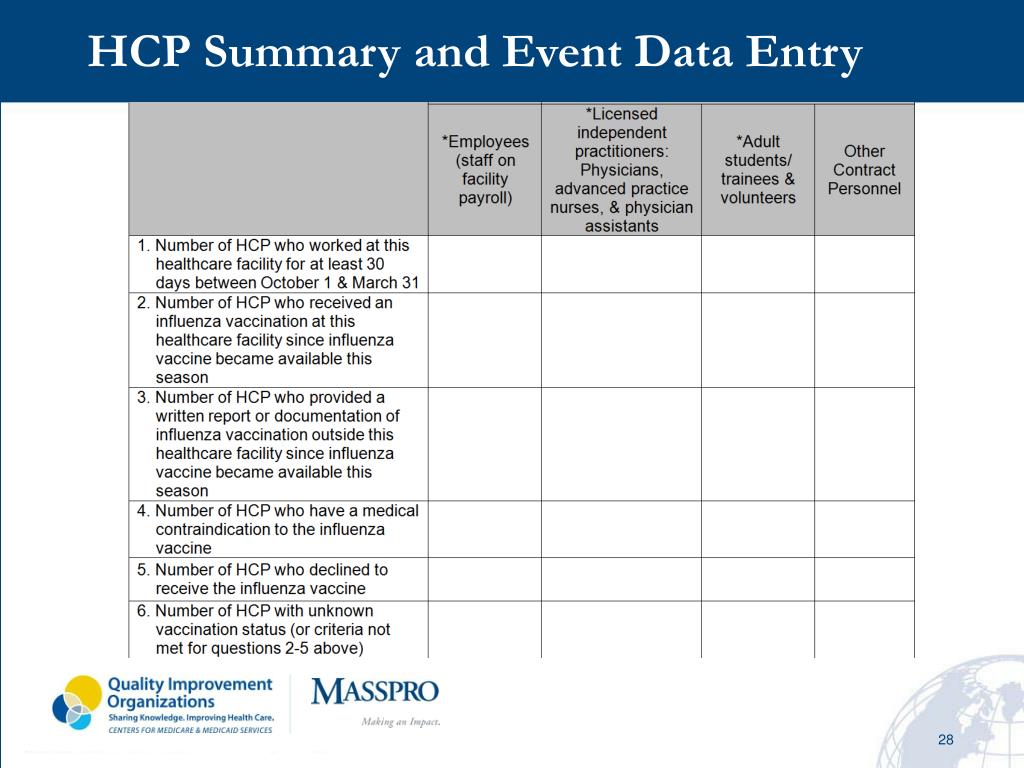 Healthcare Personnel (HCP) Influenza VaccinationSummary Method Denominator Categories HCP must be physically present in the facility for at least 30 days between October 1 and March 31. All hospital paid employees Non-employee HCP: Licensed independent practitioners (Physicians, advanced practice nurses, and physician assistants) Non-employee HCP: Adult students, trainees and volunteers (over the age of 18 years) Optional ~ Not currently required but available for use. Non-employee HCP: Other Contract personnel