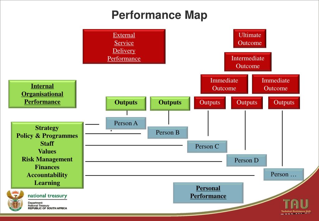 Performance Map External Service Delivery Performance Ultimate Outcome Intermediate Outcome Internal Organisational Performance Immediate Outcome Immediate Outcome Outputs Outputs Person A Outputs Outputs Outputs Strategy Policy & Programmes Staff Values Risk Management Finances Accountability Learning Person B Person C Person D Person … Personal Performance