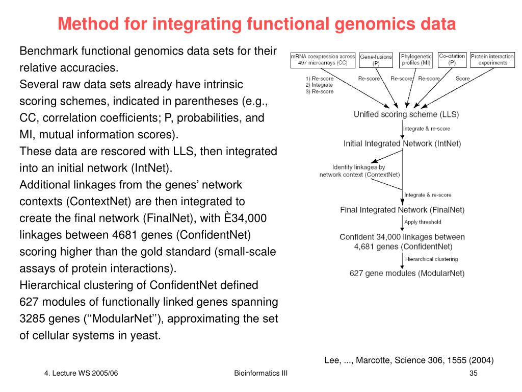 Scoring scheme for linkages Unified scoring scheme for linkages is based on a Bayesian statistics approach. Each experiment is evaluated for its ability to reconstruct known gene pathways and systems by measuring the likelihood that pairs of genes are functionally linked conditioned on the evidence, calculated as a log likelihood score: P(L|E) and P(L|E) : frequencies of linkages (L) observed in the given experiment (E) between annotated genes operating in the same pathway and in different pathways P(L) and P(L): the prior expectations (i.e., the total frequency of linkages between all annotated yeast genes operating in the same pathway and operating in different pathways). Scores > 0 indicate that the experiment tends to link genes in the same pathway, with higher scores indicating more confident linkages. Lee, ..., Marcotte, Science 306, 1555 (2004) Bioinformatics III