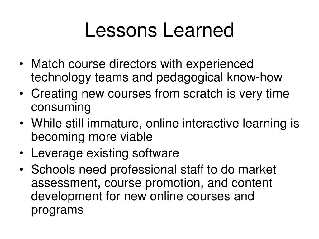 Lessons Learned • Match course directors with experienced technology teams and pedagogical know-how • Creating new courses from scratch is very time consuming • While still immature, online interactive learning is becoming more viable • Leverage existing software • Schools need professional staff to do market assessment, course promotion, and content development for new online courses and programs