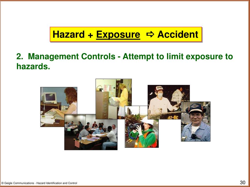 Hazard + Exposurea Accident • 2. Management Controls - Attempt to limit exposure to hazards.