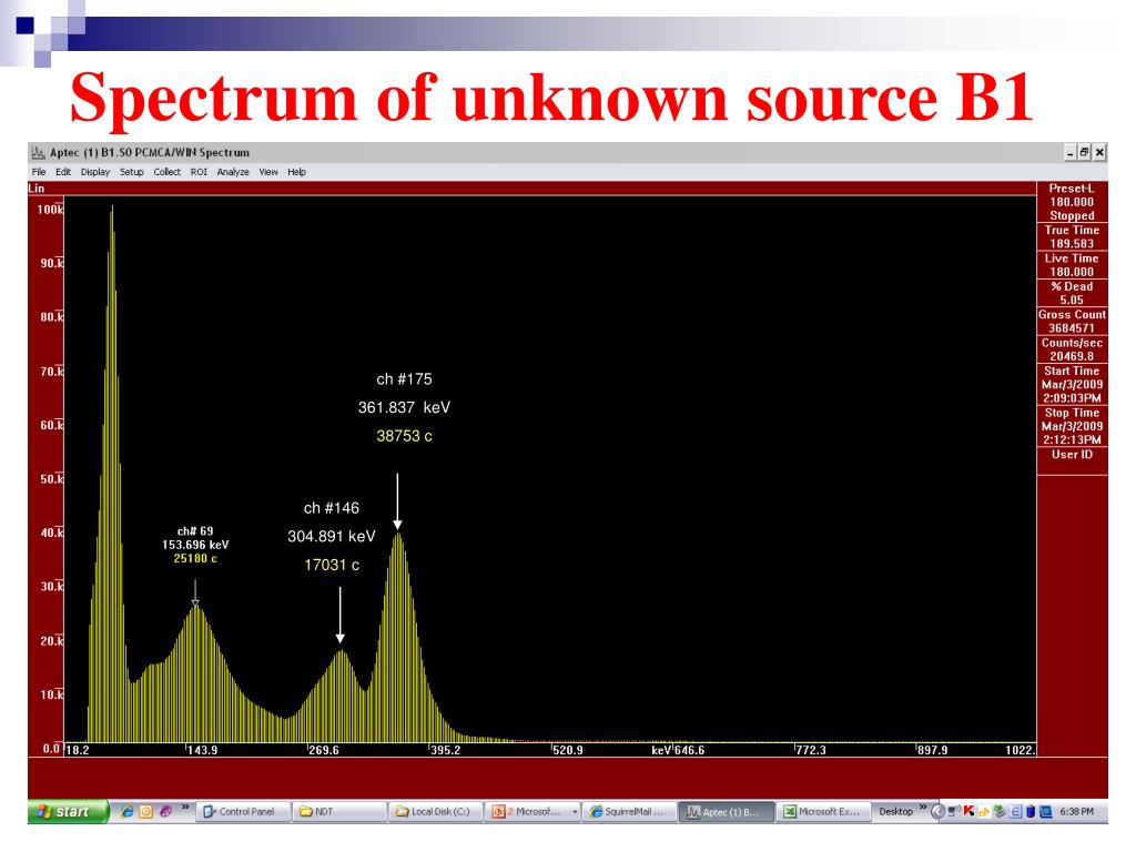 Spectrum of unknown source B1 ch #175 361.837 keV 38753 c ch #146 304.891 keV 17031 c