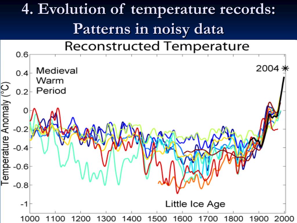 3. Medieval Records • Challenge: Temperature reconstructions from tree rings fail to show the Little Ice Age or Medieval Warm Period • Response: These were regional rather than global changes, caused by changes in the Gulf Stream and other ocean currents • New prediction? Tree rings from Western US should show no change when compared to tree rings from Northern Europe. Also, newly discovered North Atlantic corals should show increased temps vs. Pacific ones (not yet tested)