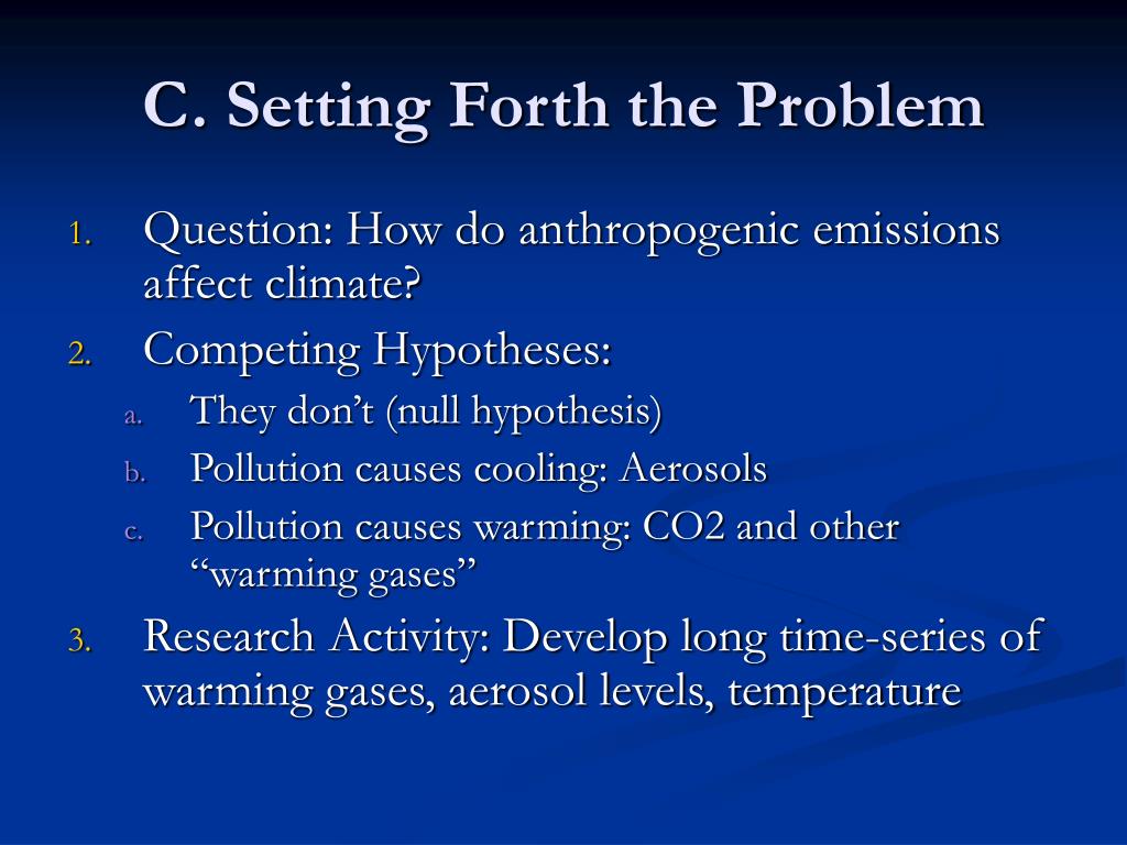 C. Setting Forth the Problem • Question: How do anthropogenic emissions affect climate? • Competing Hypotheses: • They don’t (null hypothesis) • Pollution causes cooling: Aerosols • Pollution causes warming: CO2 and other “warming gases” • Research Activity: Develop long time-series of warming gases, aerosol levels, temperature