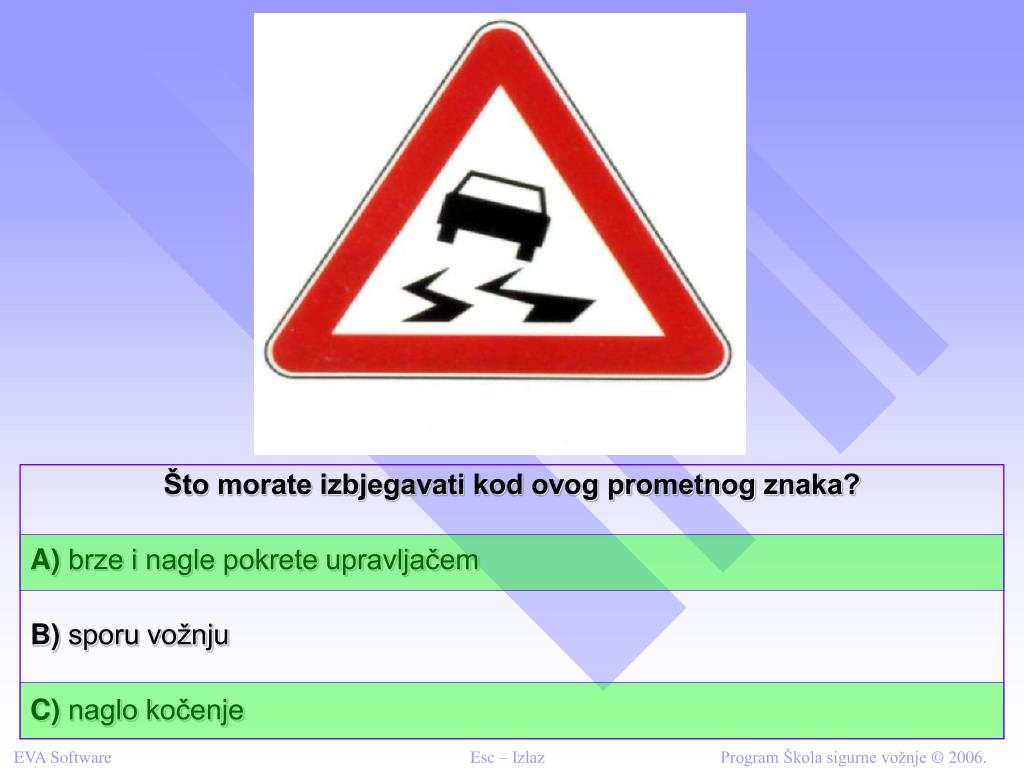 Što morate izbjegavati kod ovog prometnog znaka? A) brze i nagle pokrete upravljačem B) sporu vožnju C) naglo kočenje
