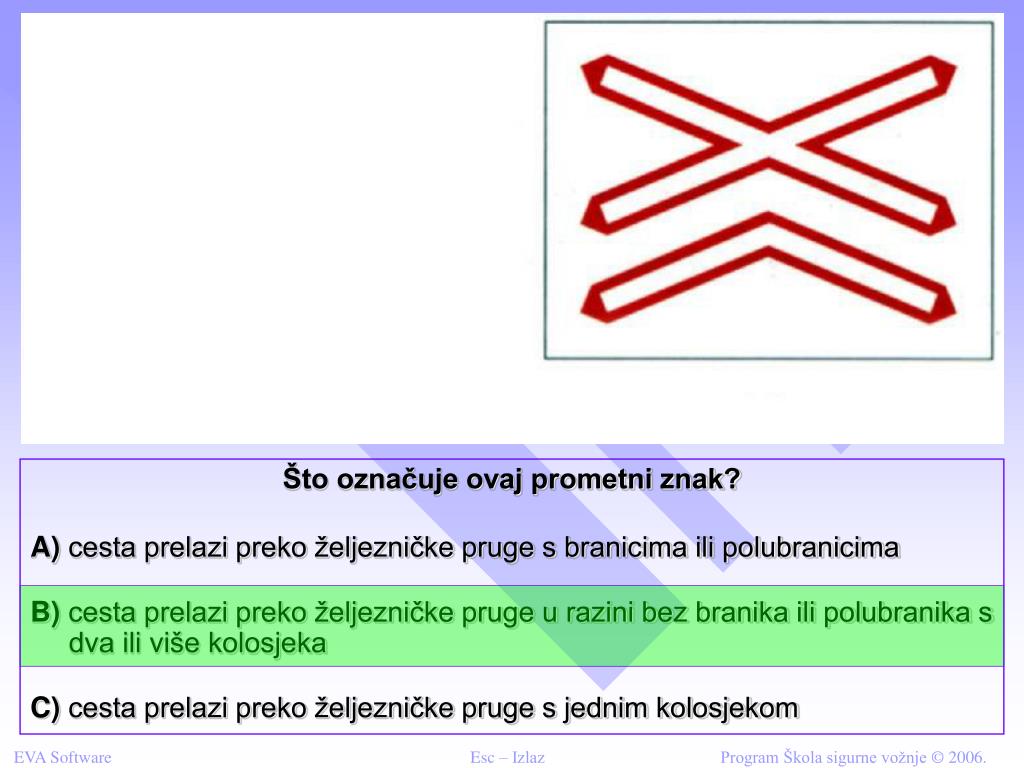 Što označuje ovaj prometni znak? A) cesta prelazi preko željezničke pruge s branicima ili polubranicima B) cesta prelazi preko željezničke pruge u razini bez branika ili polubranika s dva ili više kolosjeka C) cesta prelazi preko željezničke pruge s jednim kolosjekom