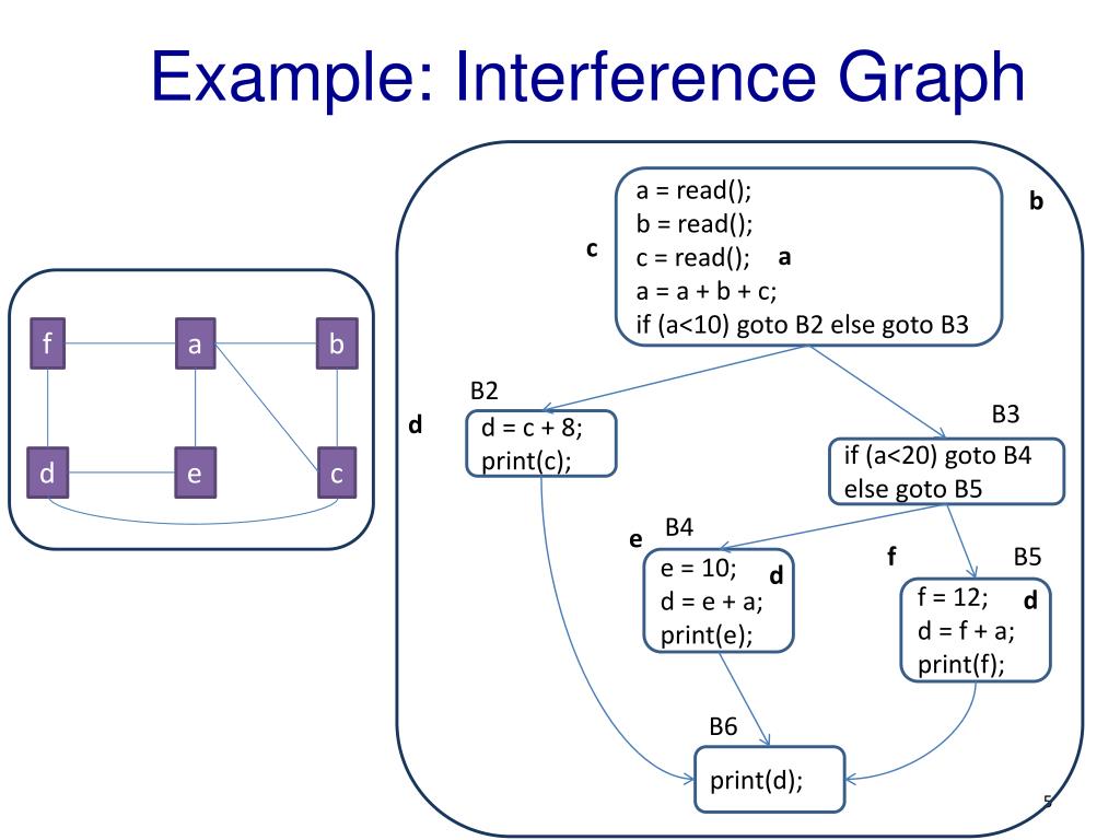 Example: Interference Graph a = read(); b = read(); c = read(); a = a + b + c; if (a<10) goto B2 else goto B3 b a c f a b B2 B3 d d = c + 8; print(c); if (a<20) goto B4 else goto B5 d e c B4 e f B5 e = 10; d = e + a; print(e); d d f = 12; d = f + a;print(f); B6 print(d);