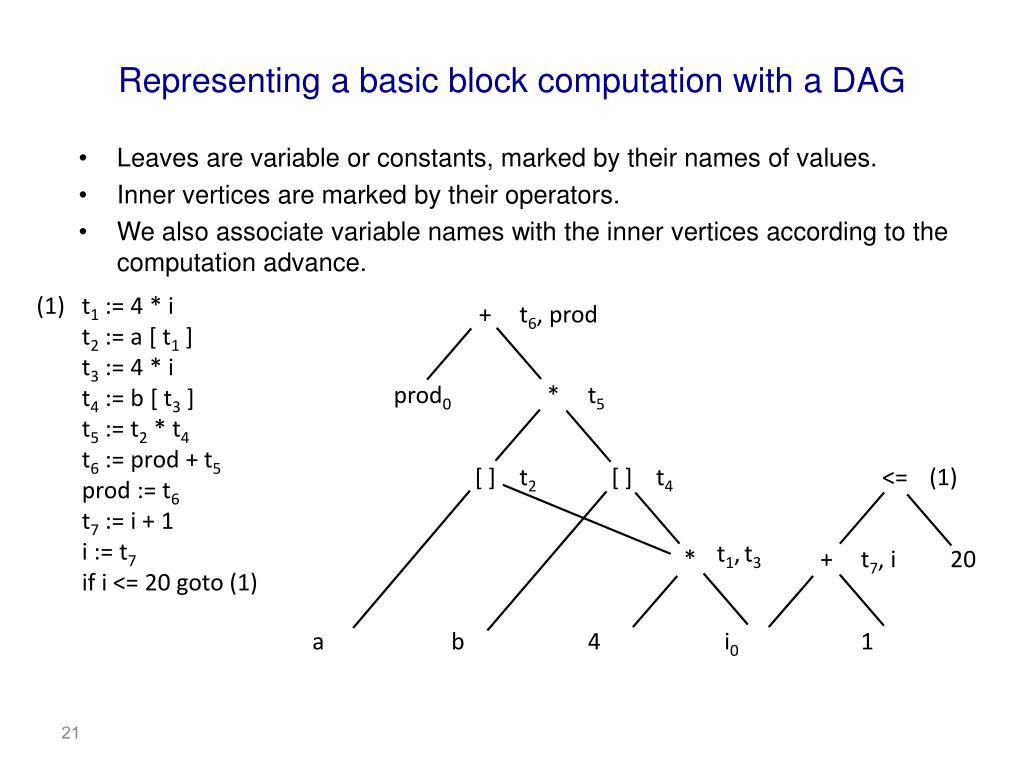 (1) t1 := 4 * i t2 := a [ t1 ] t3 := 4 * i t4 := b [ t3 ] t5 := t2* t4 t6:= prod + t5 prod := t6 t7:= i + 1 i := t7 if i <= 20 goto (1) Representing a basic block computation with a DAG • Leaves are variable or constants, marked by their names of values. • Inner vertices are marked by their operators. • We also associate variable names with the inner vertices according to the computation advance. + t6, prod prod0 * t5 [ ] t2 [ ] t4 <= (1) t1,t3 * + t7, i 20 a b 4 i0 1