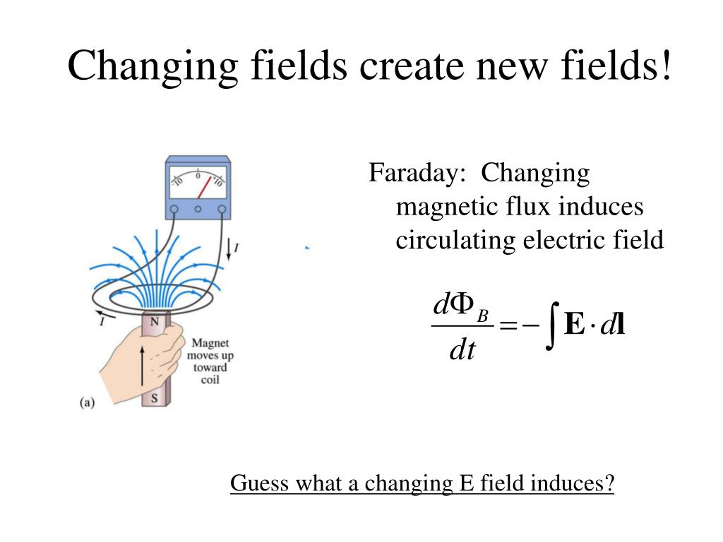Changing fields create new fields! Faraday: Changing magnetic flux induces circulating electric field Guess what a changing E field induces?