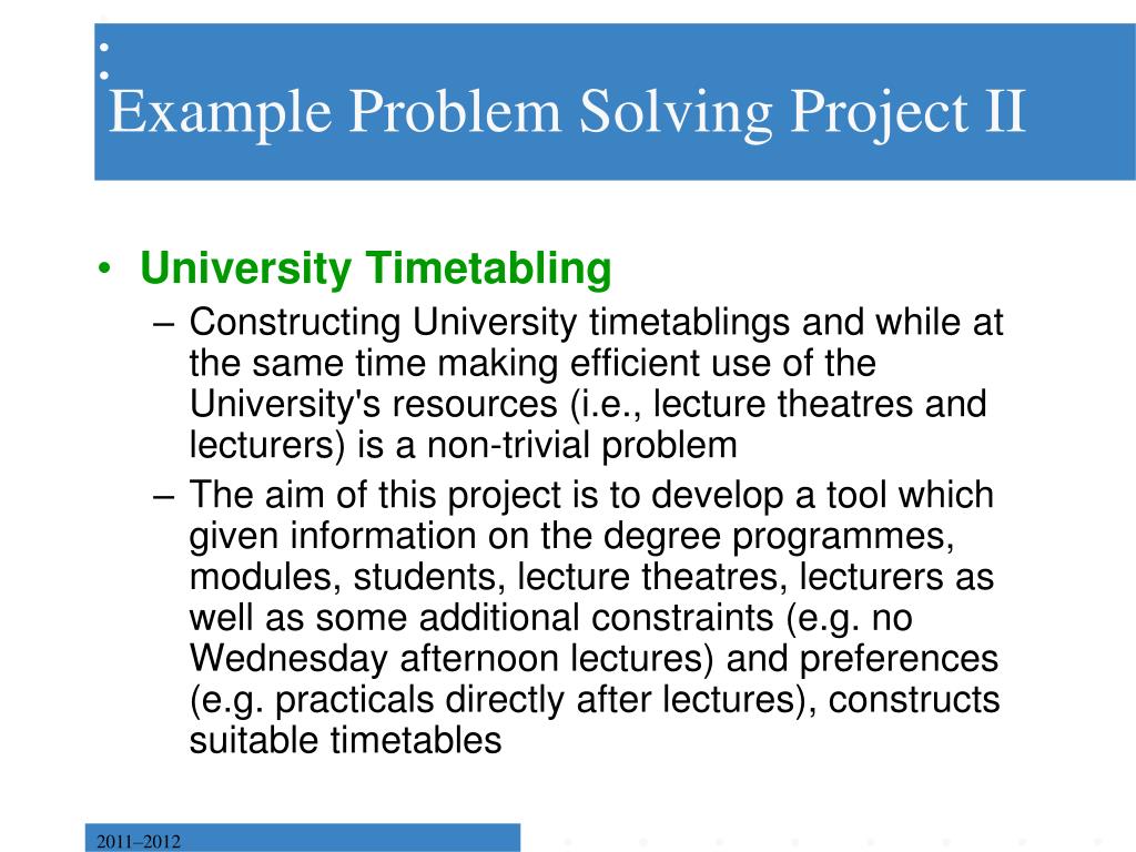 Example Problem Solving Project II • University Timetabling • Constructing University timetablings and while at the same time making efficient use of the University's resources (i.e., lecture theatres and lecturers) is a non-trivial problem • The aim of this project is to develop a tool which given information on the degree programmes, modules, students, lecture theatres, lecturers as well as some additional constraints (e.g. no Wednesday afternoon lectures) and preferences (e.g. practicals directly after lectures), constructs suitable timetables