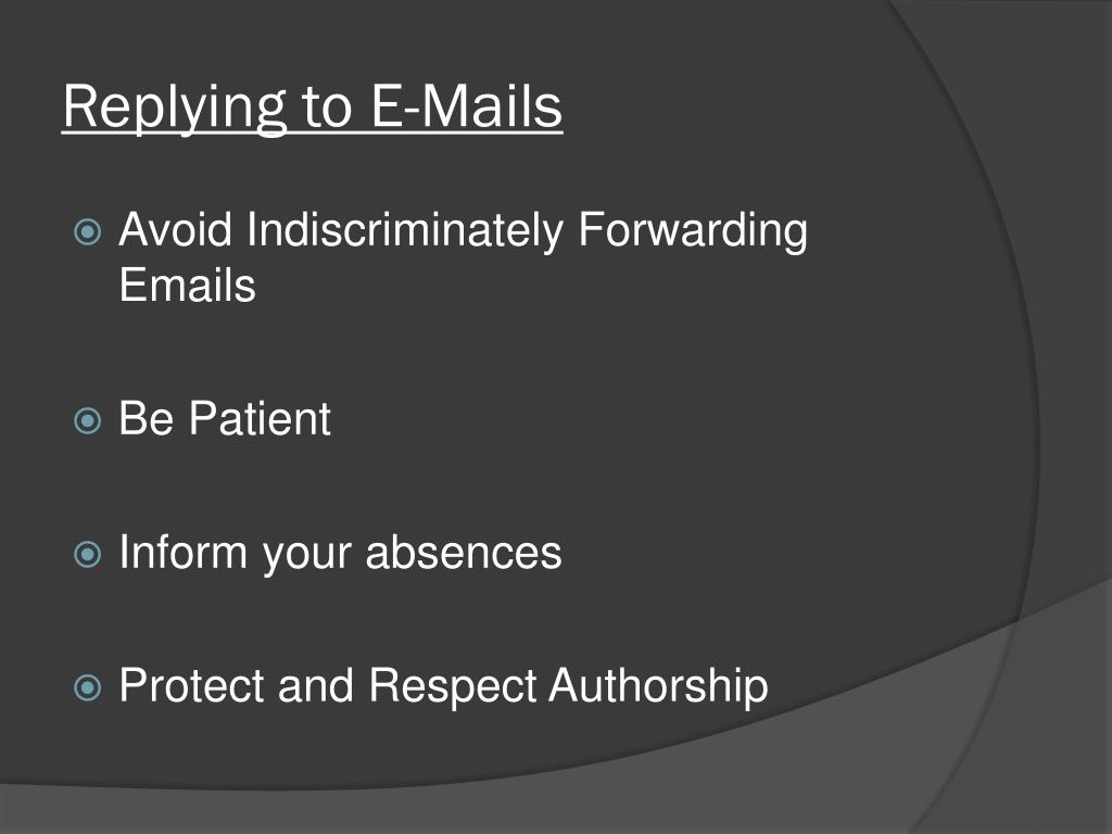 Replying to E-Mails • Avoid Indiscriminately Forwarding Emails • Be Patient • Inform your absences • Protect and Respect Authorship