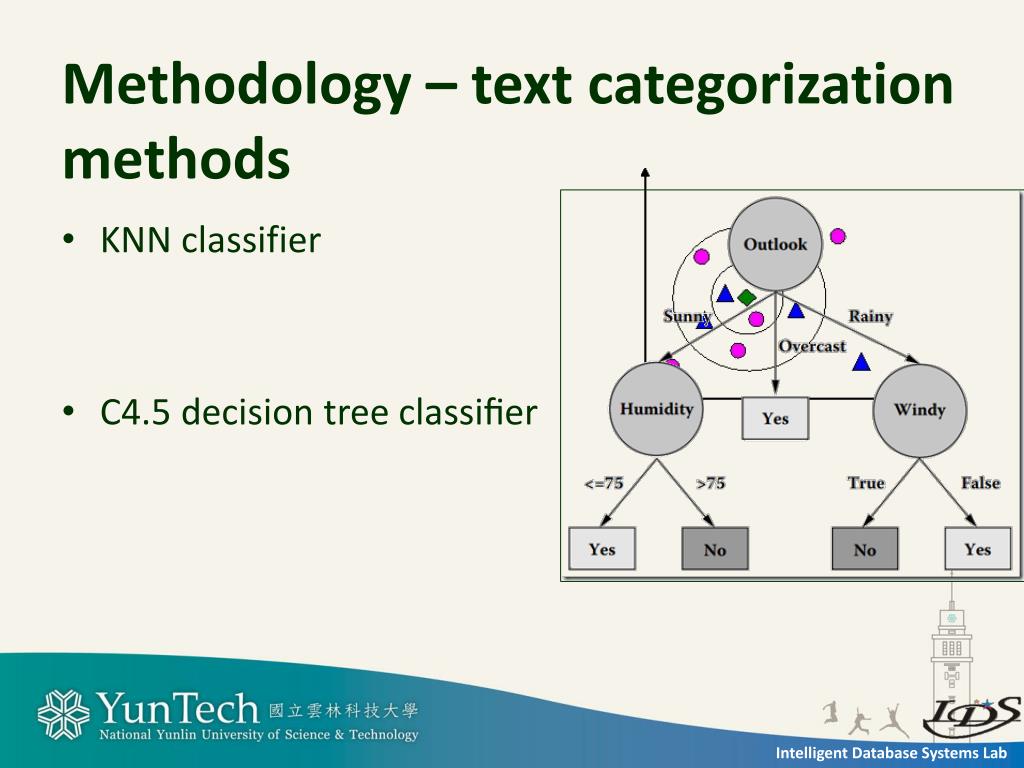 Methodology – text categorization methods • KNN classifier • C4.5 decision tree classifier
