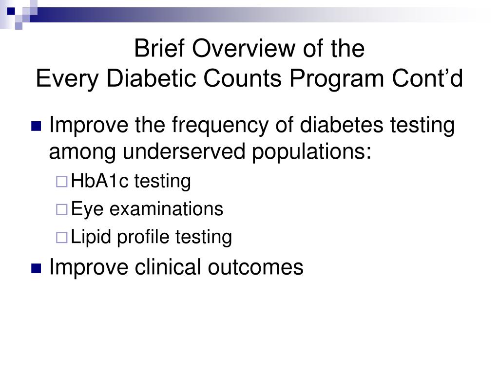 Brief Overview of the Every Diabetic Counts Program Cont’d • Improve the frequency of diabetes testing among underserved populations: • HbA1c testing • Eye examinations • Lipid profile testing • Improve clinical outcomes
