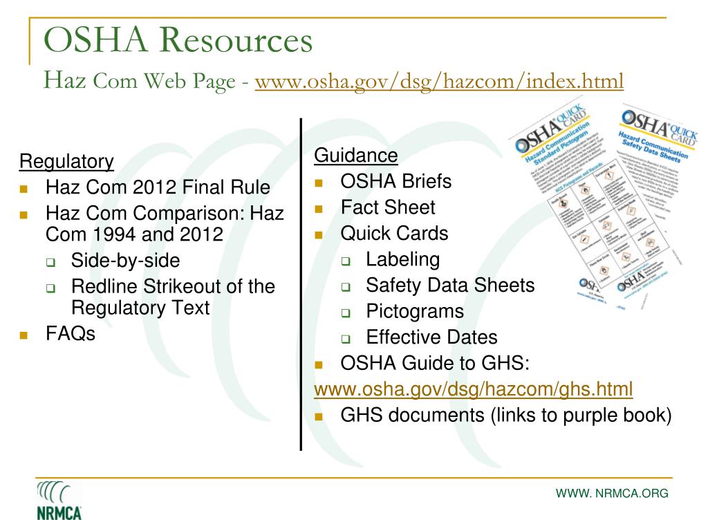 Regulatory Haz Com 2012 Final Rule Haz Com Comparison: Haz Com 1994 and 2012 Side-by-side Redline Strikeout of the Regulatory Text FAQs Guidance OSHA Briefs Fact Sheet Quick Cards Labeling Safety Data Sheets Pictograms Effective Dates OSHA Guide to GHS: www.osha.gov/dsg/hazcom/ghs.html GHS documents (links to purple book) OSHA ResourcesHaz Com Web Page - www.osha.gov/dsg/hazcom/index.html