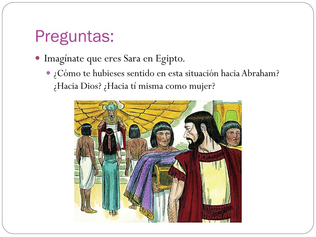Preguntas: • Imagínatequeeres Sara en Egipto. • ¿Cómotehubiesessentido en estasituaciónhacia Abraham? ¿Hacia Dios? ¿Haciatímismacomomujer?