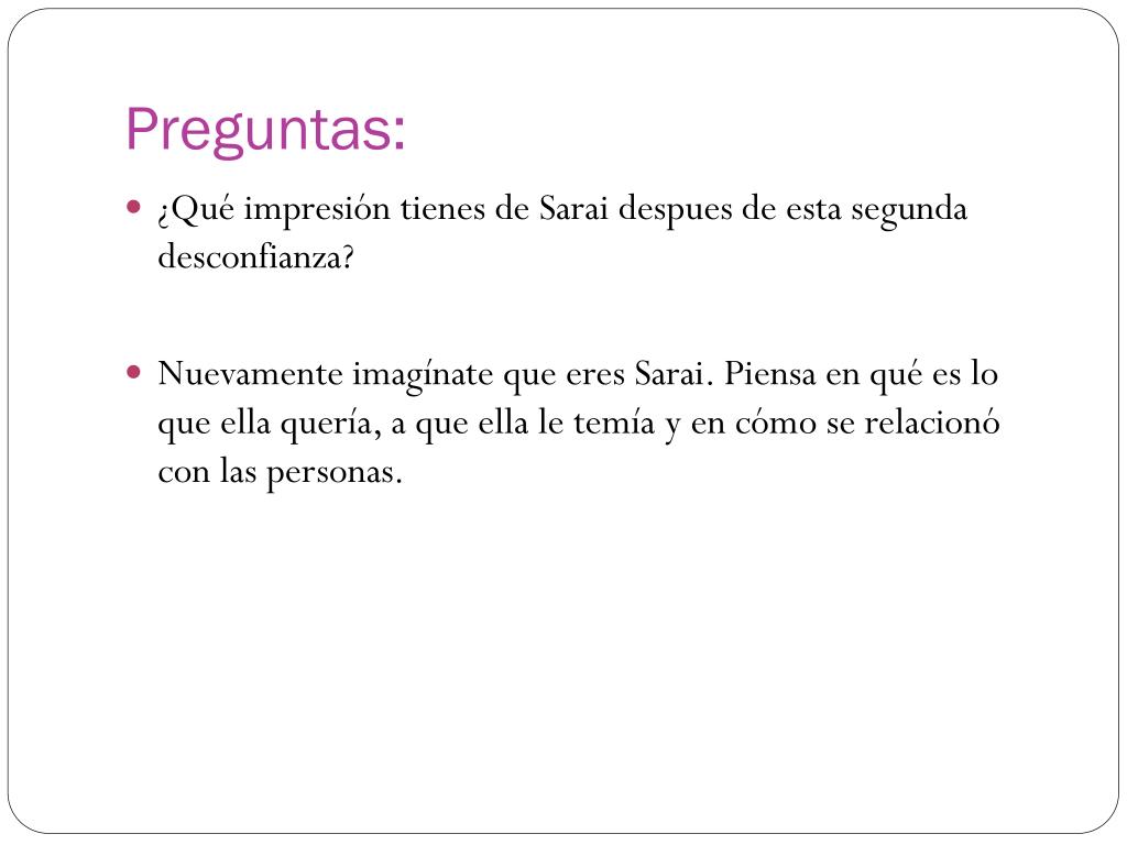 Preguntas: • ¿Quéimpresióntienes de Saraidespues de estasegundadesconfianza? • NuevamenteimagínatequeeresSarai. Piensa en quées lo queellaquería, a queella le temía y en cómo se relacionó con las personas.