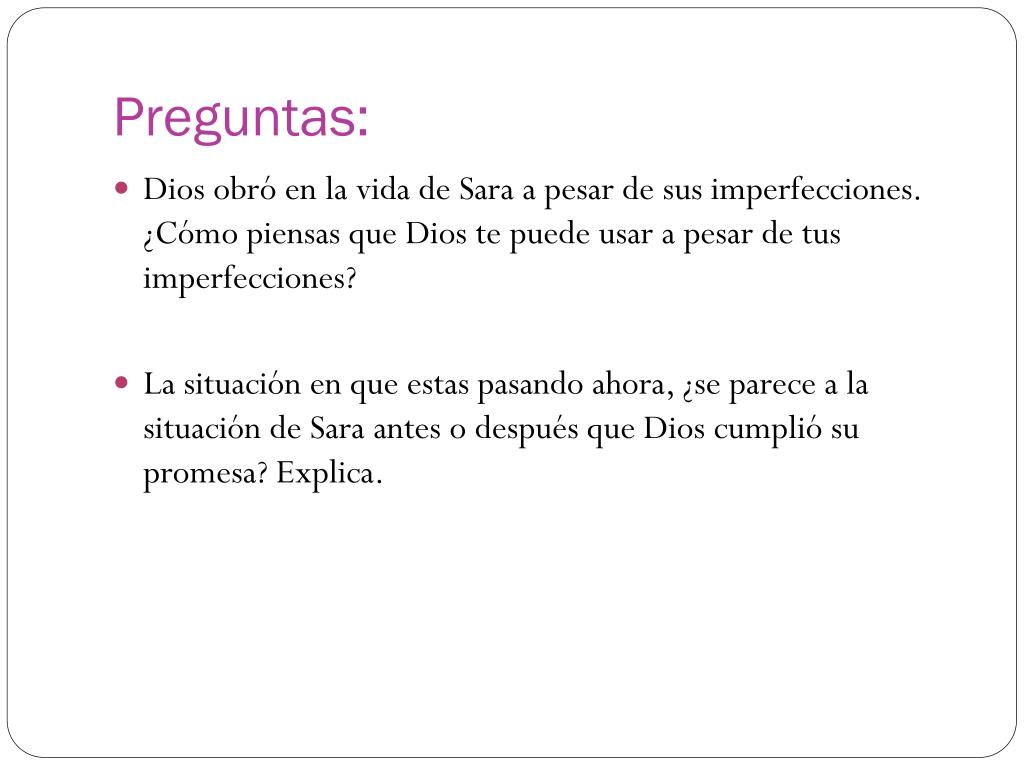 Preguntas: • Dios obró en la vida de Sara a pesar de susimperfecciones. ¿Cómopiensasque Dios tepuedeusar a pesar de tusimperfecciones? • La situación en queestaspasandoahora, ¿se parece a la situación de Sara antes o despuésque Dios cumpliósupromesa? Explica.
