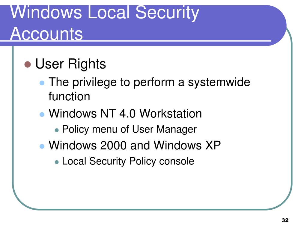Windows Local Security Accounts • User Rights • The privilege to perform a systemwide function • Windows NT 4.0 Workstation • Policy menu of User Manager • Windows 2000 and Windows XP • Local Security Policy console