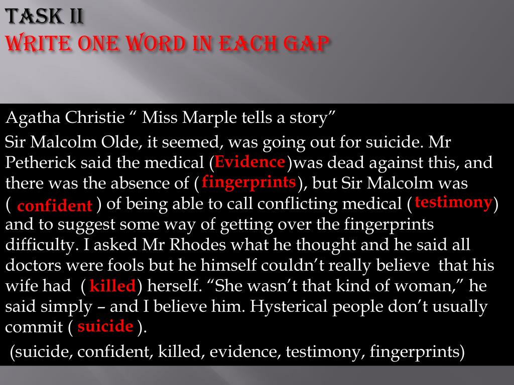 TASK IIWRITE ONE WORD IN EACH GAP Agatha Christie “ Miss Marple tells a story” Sir Malcolm Olde, it seemed, was going out for suicide. MrPetherick said the medical ( )was dead against this, and there was the absence of ( ), but Sir Malcolm was ( ) of being able to call conflicting medical ( ) and to suggest some way of getting over the fingerprints difficulty. I asked Mr Rhodes what he thought and he said all doctors were fools but he himself couldn’t really believe that his wife had ( ) herself. “She wasn’t that kind of woman,” he said simply – and I believe him. Hysterical people don’t usually commit ( ). (suicide, confident, killed, evidence, testimony, fingerprints) Evidence fingerprints testimony confident killed suicide