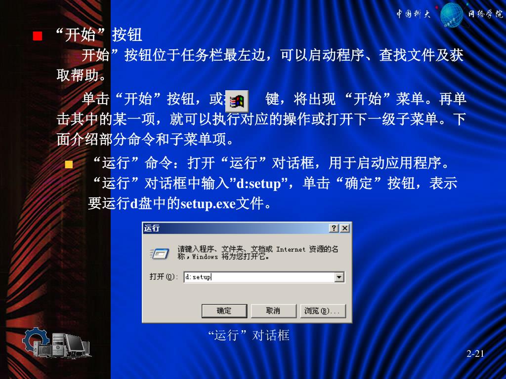 “运行”对话框 “开始”按钮 开始”按钮位于任务栏最左边,可以启动程序、查找文件及获取帮助。 单击“开始”按钮,或按 键,将出现 “开始”菜单。再单击其中的某一项,就可以执行对应的操作或打开下一级子菜单。下面介绍部分命令和子菜单项。 • “运行”命令:打开“运行”对话框,用于启动应用程序。 “运行”对话框中输入”d:setup”,单击“确定”按钮,表示要运行d盘中的setup.exe文件。