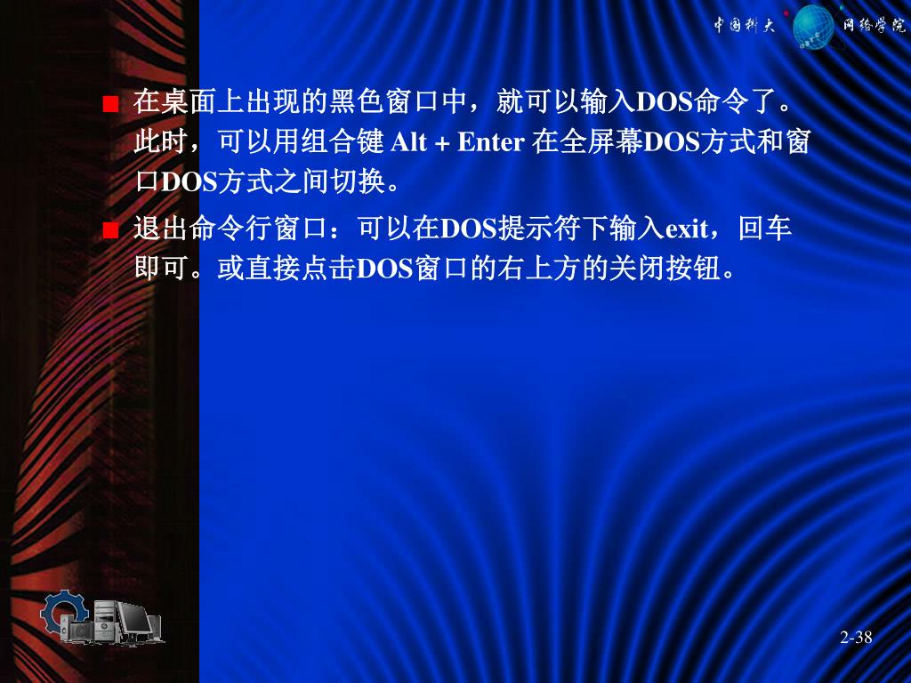 在桌面上出现的黑色窗口中,就可以输入DOS命令了。此时,可以用组合键 Alt + Enter 在全屏幕DOS方式和窗口DOS方式之间切换。 • 退出命令行窗口:可以在DOS提示符下输入exit,回车即可。或直接点击DOS窗口的右上方的关闭按钮。