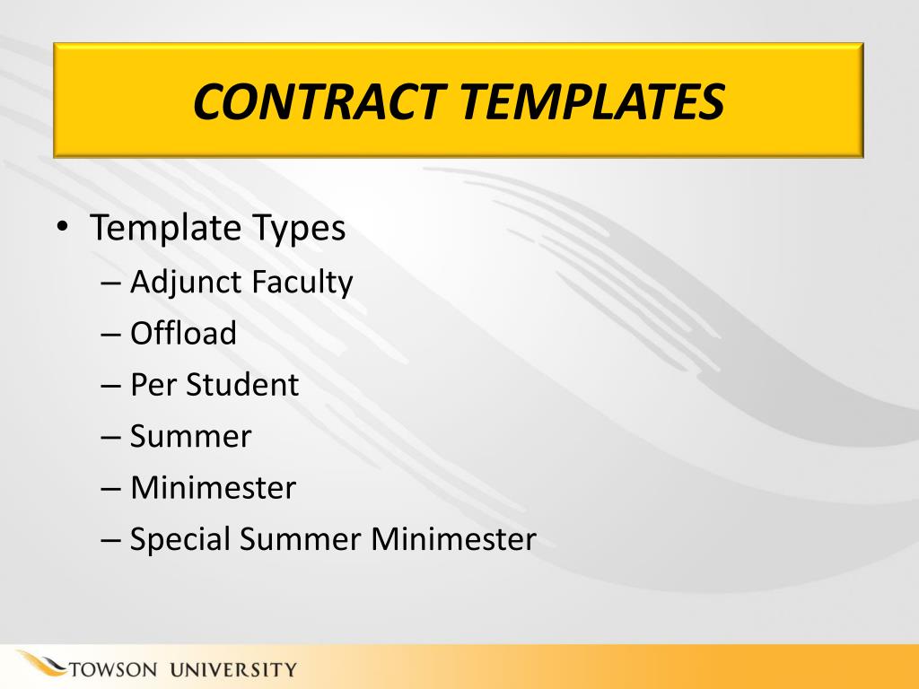 CONTRACT TEMPLATES CONTRACT TEMPLATES • Template Types • Adjunct Faculty • Offload • Per Student • Summer • Minimester • Special Summer Minimester